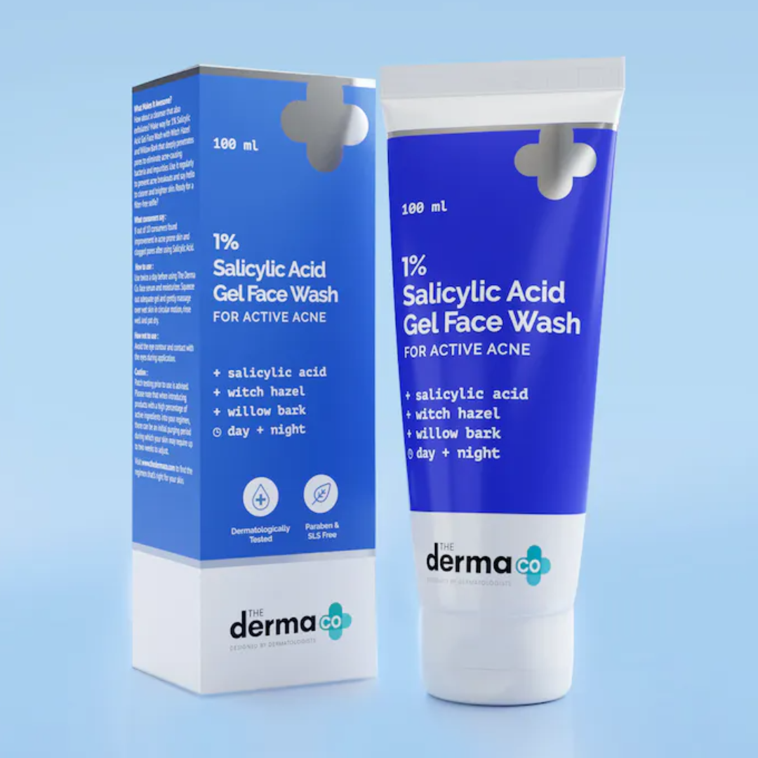 The Derma Co. 1% Salicylic Acid Gel Face Wash with Witch Hazel and Willow Bark that deeply penetrates pores to eliminate acne-causing bacteria and impurities. Salicylic Acid has anti-inflammatory properties that play an important role in fading away red-inflamed pimples.